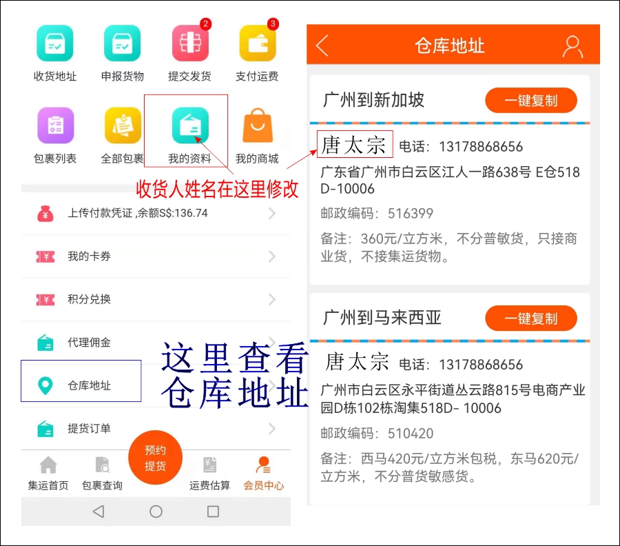 每个顾客都有自己的独有唯一地址,请到这里查看:微信公众号--会员中心--仓库地址: